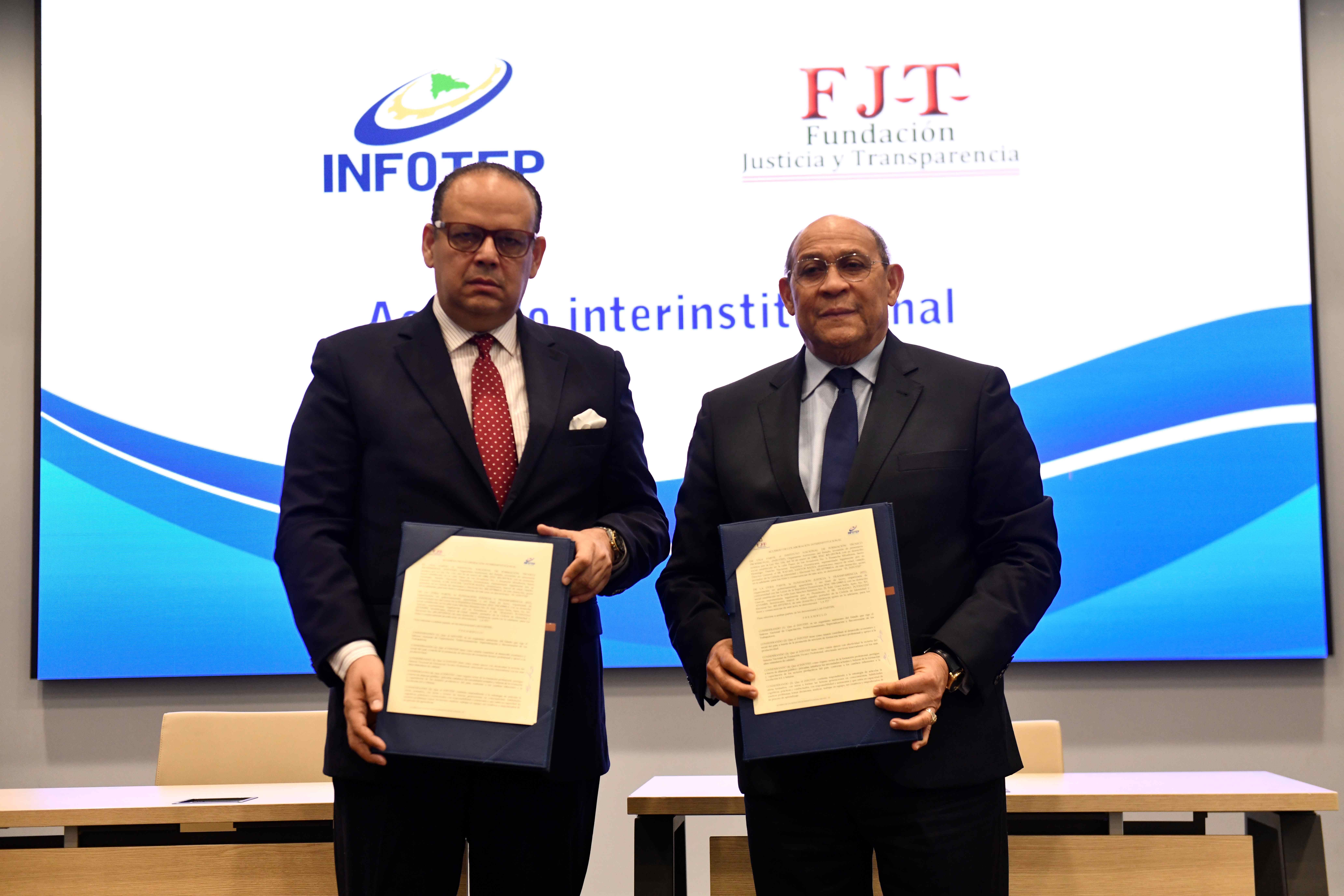 Santo Domingo RD .- El Instituto Nacional de Formación Técnico Profesional (INFOTEP) y la Fundación Justicia y Transparencia (FJT) firmaron un convenio con el objetivo de desarrollar iniciativas de promoción y difusión de la ética y la transparencia en la administración pública.