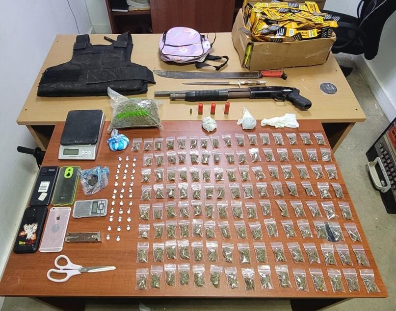 Durante los allanamientos, se incautaron una escopeta marca Maverick, de serie no legible; un chaleco antibalas; un cargador para pistola de 9 mm; tres celulares; una tijera; y dos balanzas.