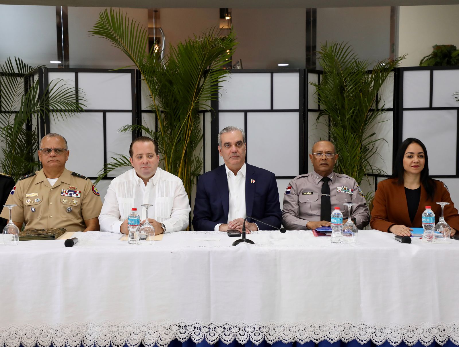 En compañía del jefe de Estado se encuentran los ministros de la Presidencia, José Ignacio Paliza; de Interior y Policía, Faride Raful; de Defensa, teniente general Carlos Antonio Fernández Onofre; la procuradora general de la República, Yeni Berenice Reynoso; el director de la Policía Nacional, mayor general, Ramón Antonio Guzmán Peralta; el comandante general de la Armada de República Dominicana y del Comando Conjunto Unificado, vicealmirante Agustín Alberto Morillo Rodríguez; el coronel Carlos Javier Carrillo Castillo, en representación del comandante general del Ejército Nacional, mayor general, Jorge Iván Camino Pérez; el coronel paracaidista, Osvaldo W. Montero Mena, en representación del Comandante General de la Fuerza Aérea Dominicana, mayor general piloto, Floreal T. Suárez Martínez; el capitán de Navío, Rafael García Aybar de la Armada de República Dominicana y el viceministro de la Presidencia para Proyectos Especiales y Coordinación de Seguridad, Roger G. Pujols.